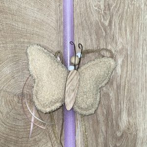 Μωβ ιριζέ λαμπάδα με διακοσμητική πεταλούδα υφασμάτινη
