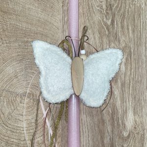 Ροζ ιριζέ λαμπάδα με διακοσμητική πεταλούδα υφασμάτινη