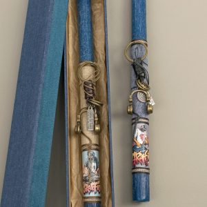 Μπλε στρογγυλή λαμπάδα με μπρελόκ ακουστικά με μαύρο δερματάκι