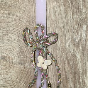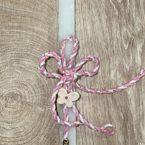 Ροζ τετράγωνη λαμπάδα με πολύχρωμο κορδόνι και πεταλουδίτσα