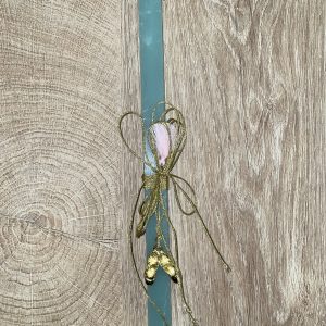Λευκή στρογγυλή ιριζέ λαμπάδα με διακοσμητικό κουνελάκι με πούπουλα