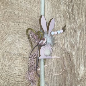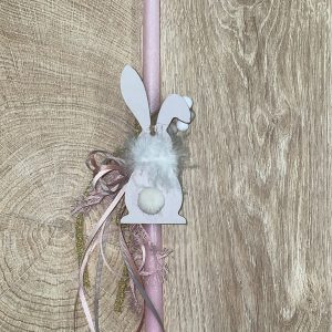 Ροζ στρογγυλή ιριζέ λαμπάδα με διακοσμητικό κουνελάκι με πούπουλα