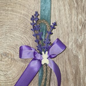 Πετρόλ τετράγωνη λαμπάδα με λεβάντα και μικρό κουνελάκι