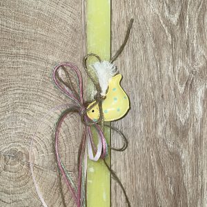 Κίτρινη τετράγωνη λαμπάδα με μεταλλικό πουλάκι πουά