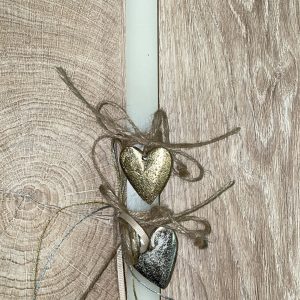 Μπεζ τετράγωνη λαμπάδα με μεταλλικές καρδιές