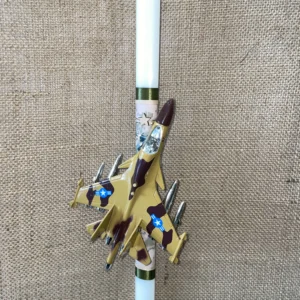 Λευκή στρογγυλή λαμπάδα με καφέ μαχητικό αεροπλάνο
