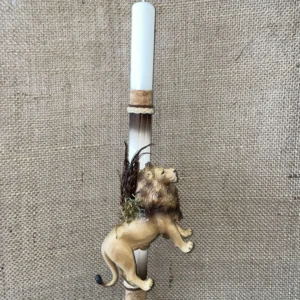 Λευκή στρογγυλή λαμπάδα με παιχνίδι λιονταρι