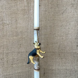 Λευκή στρογγυλή λαμπάδα με παιχνίδι σκύλο ( Γερμανικό Ποιμενικό)