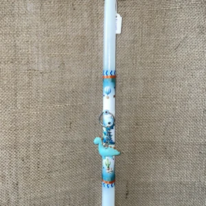 Λευκή στρογγυλή λαμπάδα με γαλάζιο φόντο με δεινοσαυράκια και μπρελόκ δεινοσαυράκι