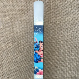 Λευκή πλακέ λαμπάδα με μπλε ντεκουπάζ Lilo & Stitch