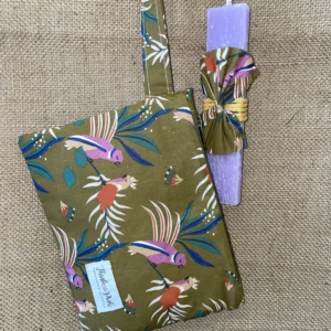 Μωβ πλακέ αρωματική λαμπάδα με εμπριμέ ύφασμα χακί και νεσεσέρ/τσαντάκι στο ίδιο ύφασμα