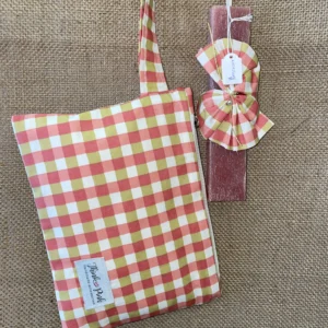 Μπορντώ πλακέ αρωματική λαμπάδα με καρώ ύφασμα και νεσεσέρ/τσαντάκι στο ίδιο ύφασμα