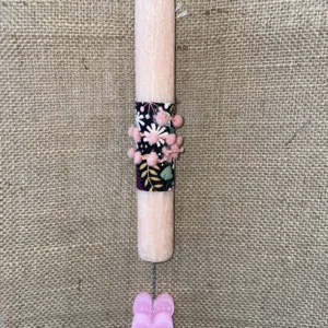 Σωμόν στρογγυλή αρωματική λαμπάδα με εμπριμέ μαύρο ύφασμα και 2 καρδιές που κρέμονται