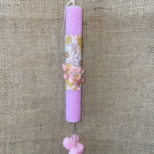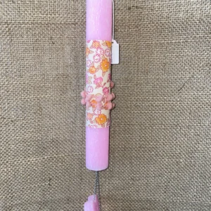 Ροζ στρογγυλή αρωματική λαμπάδα με εμπριμέ ύφασμα και 2 καρδιές που κρέμονται