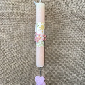 Μπεζ/σωμόν στρογγυλή αρωματική λαμπάδα με εμπριμέ ύφασμα και 2 καρδιές που κρέμονται