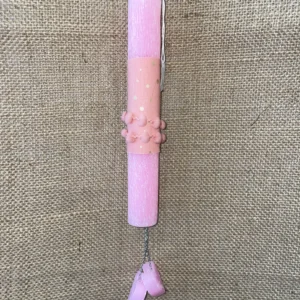 Ροζ στρογγυλή αρωματική λαμπάδα με πουά ύφασμα και 2 καρδιές που κρέμονται