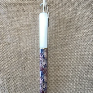Λευκή στρογγυλά λαμπάδα με ντεκουπάζ λεπτό εμπριμέ σε ροζ, καφέ και γαλάζιες αποχρώσεις
