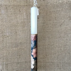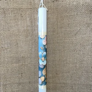 Λευκή στρογγυλή λαμπάδα με ντεκουπάζ με μπλε φόντο και γαλάζια και ροζ λουλούδια