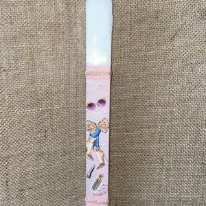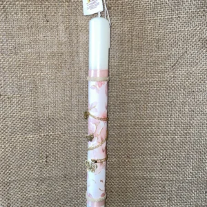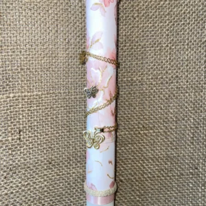 Λευκή στρογγυλή λαμπάδα με ροζ φόντο και χρυσό κολιέ με πεταλούδες
