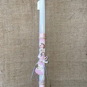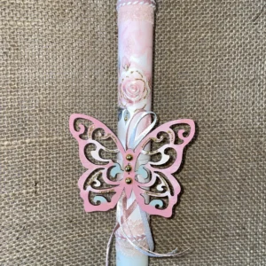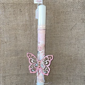 Λευκή στρογγυλή λαμπάδα με ροζ φόντο με τριαντάφυλλα και ξύλινη διακοσμητική πεταλούδα