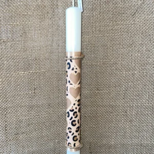 Λευκή στρογγυλή λαμπάδα με θέμα λεοπάρ με καρδιές