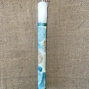 Λευκή στρογγυλή λαμπάδα με γαλάζιο φόντο με γεωμετρικά σχέδια