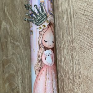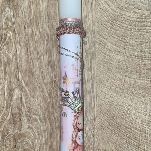 Λευκή στρογγυλή λαμπάδα με πριγκιπισούλα και κολιέ με κορώνα