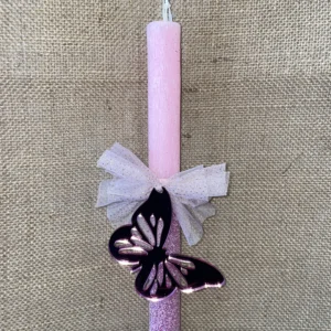 Ροζ στρογγυλή αρωματική λαμπάδα, μισή ιριζέ, με plexiglass καθρέφτη πεταλούδα