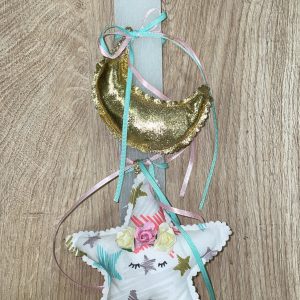 Λευκή πλακέ λαμπάδα με υφασμάτινο αστέρι και φεγγάρι
