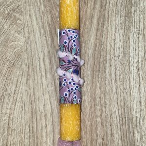 Κίτρινη στρογγυλή λαμπάδα με πον πον και καρδιές που κρέμονται