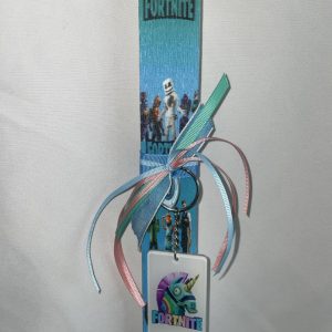 Λαμπάδα πλακέ με ντεκουπάζ με θέμα Fortnite και μπρελόκ