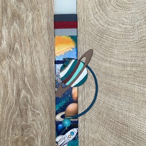 Λευκή πλακέ λαμπάδα με πλανήτη ξύλινο