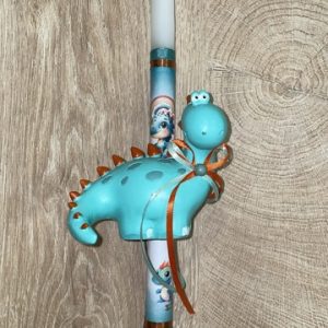 Λευκή στρογγυλή λαμπάδα με δεινοσαυράκι κουμπαρά