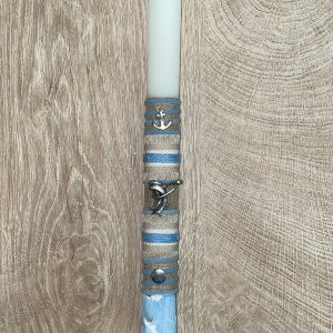 Λευκή στρογγυλή λαμπάδα με δελφίνια και άγκυρα