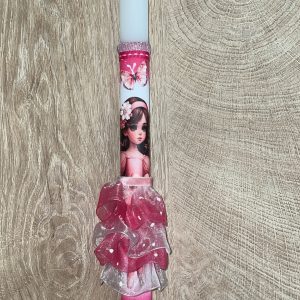 Λευκή στρογγυλή λαμπάδα με κοριτσάκι με κόκκινο φόρεμα
