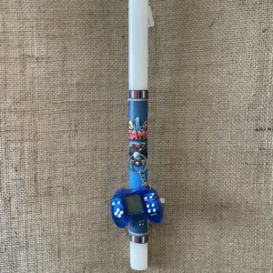 Λευκή στρογγυλή λαμπάδα με μπρελόκ που είναι control Playstation