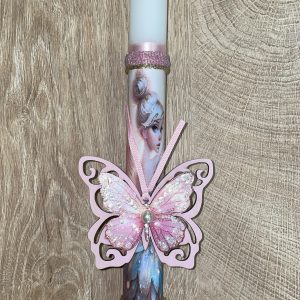 Λευκή στρογγυλή λαμπάδα με νεράϊδα και πεταλούδα