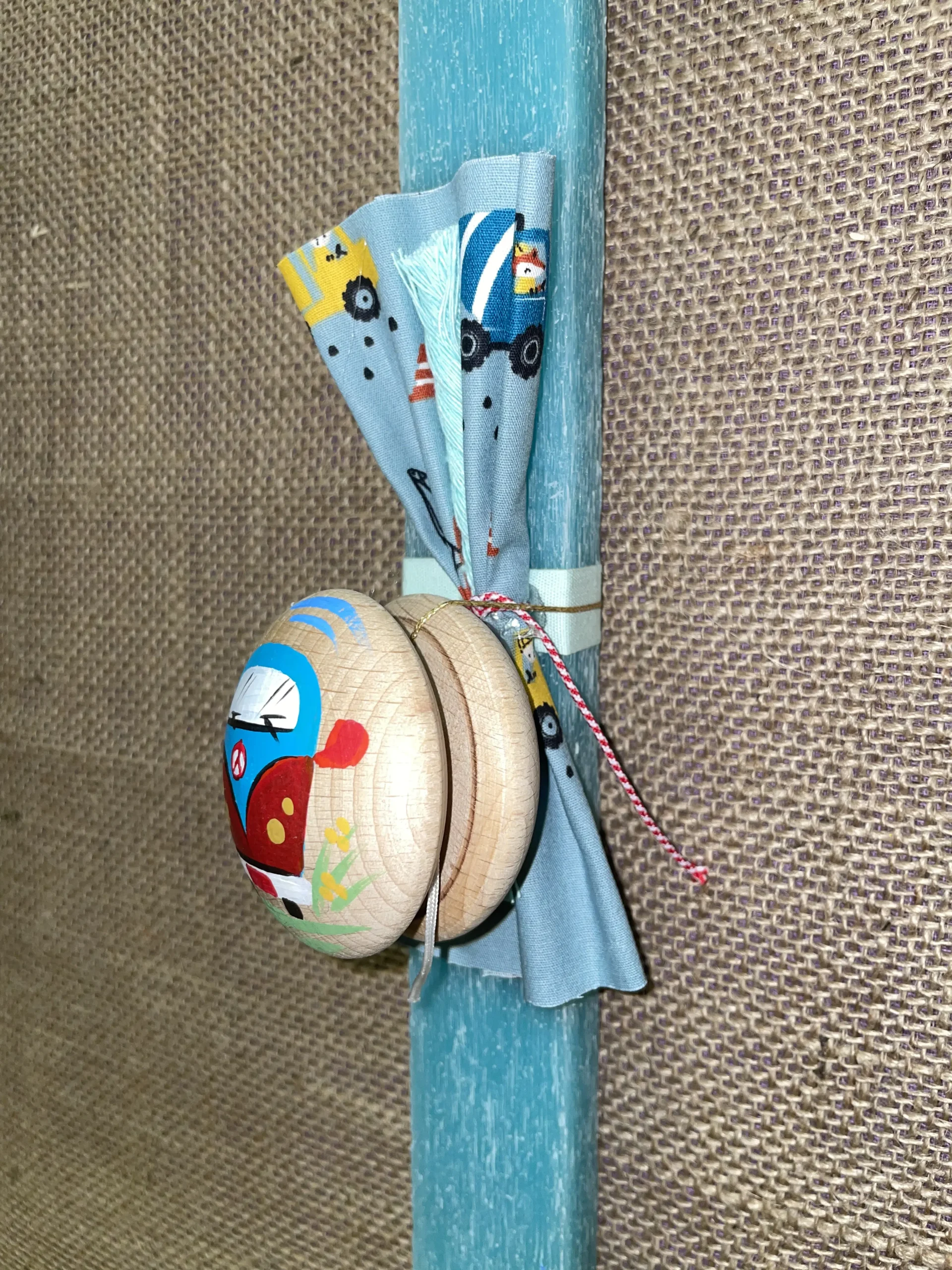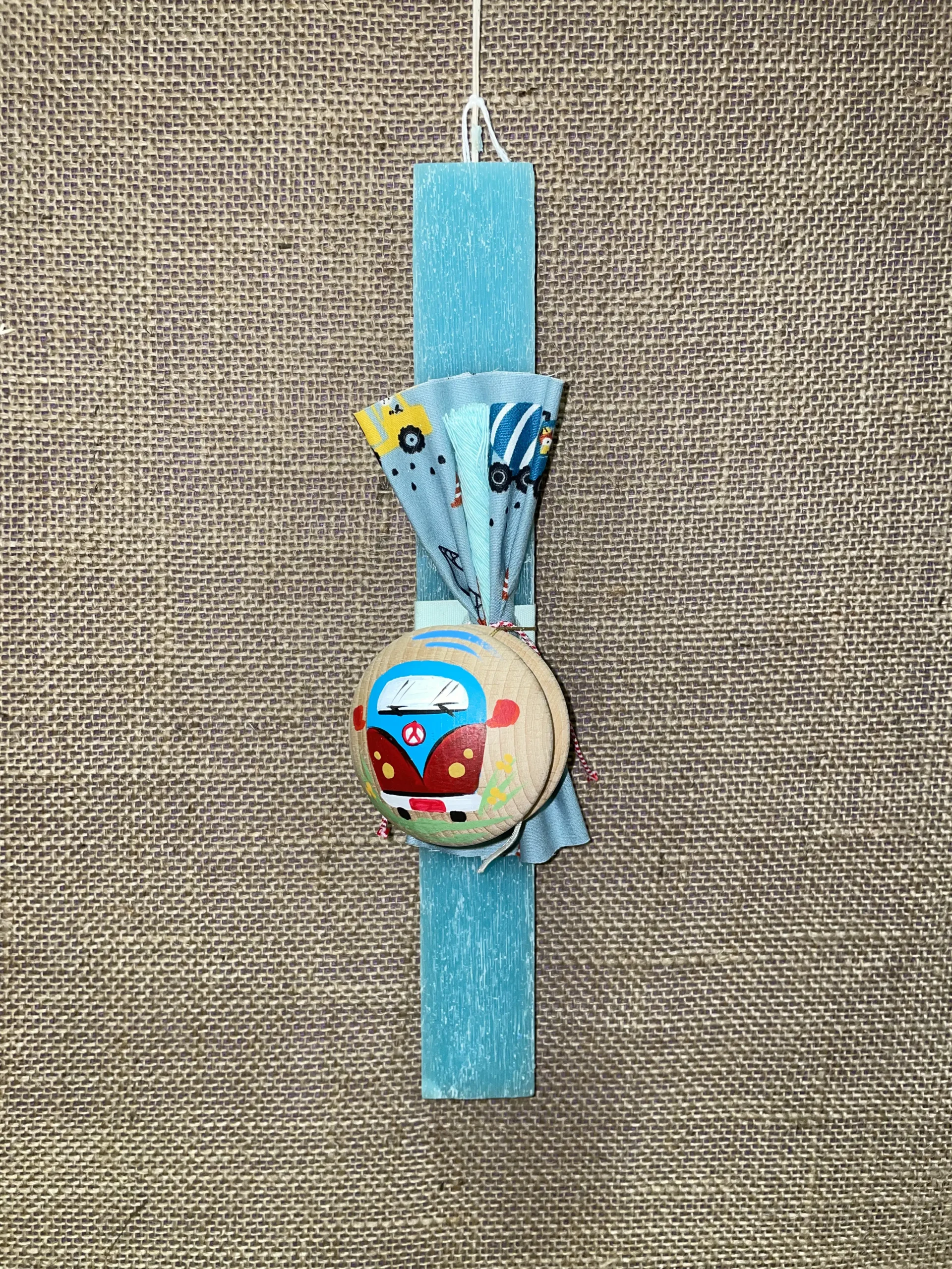 Ετικέτα: Γαλάζια πλακέ αρωματική λαμπάδα με ξύλινο γιογιό με δεινοσαυράκι