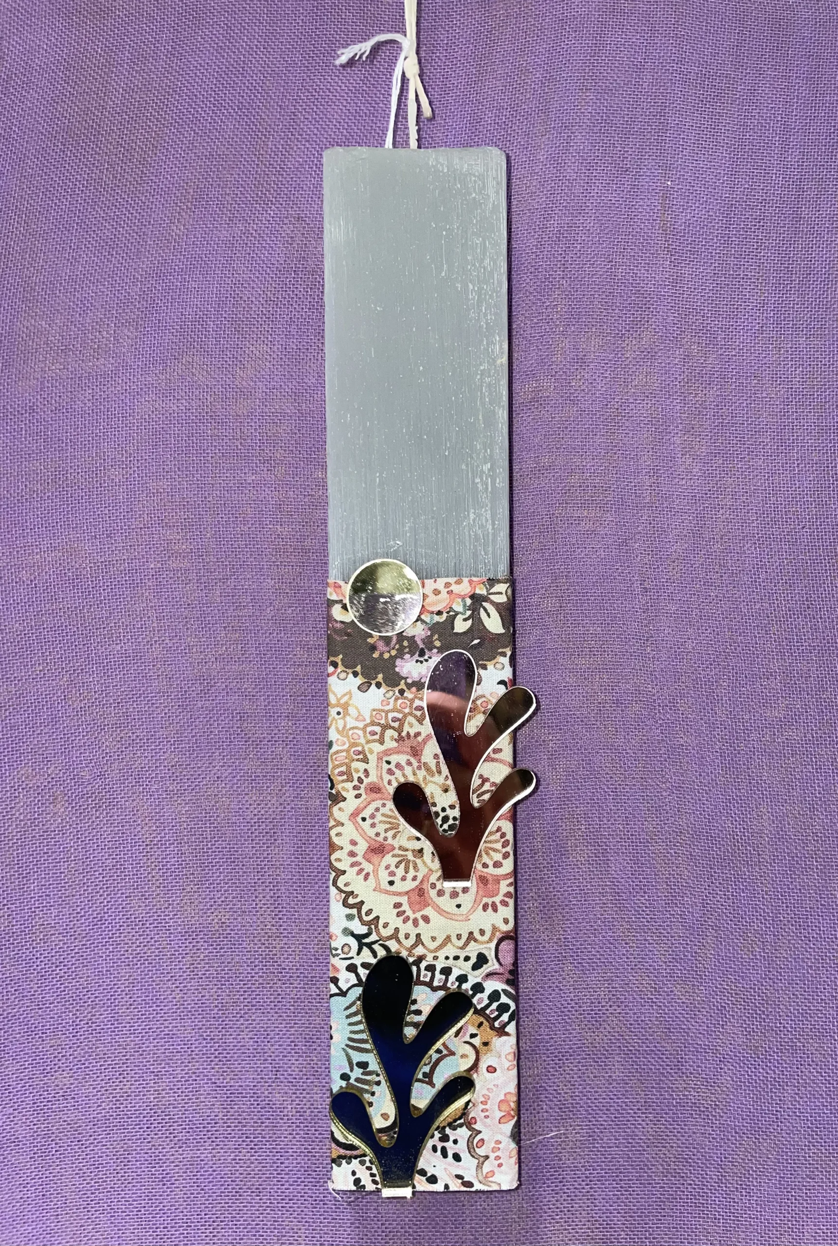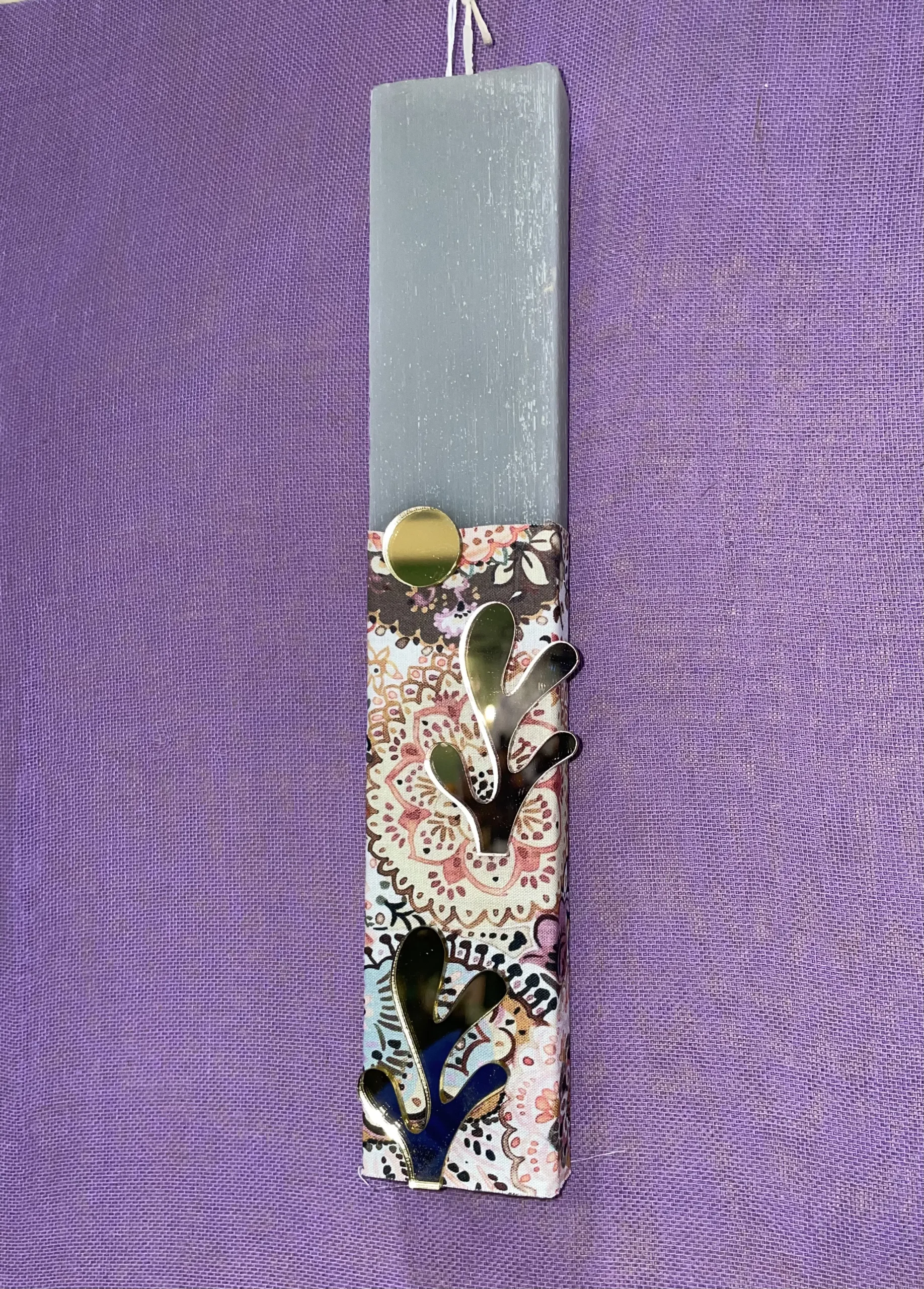 Ετικέτα: Γαλάζια πλακέ λαμπάδα με φλοράλ ύφασμα και χρυσό plexiglass φυτό