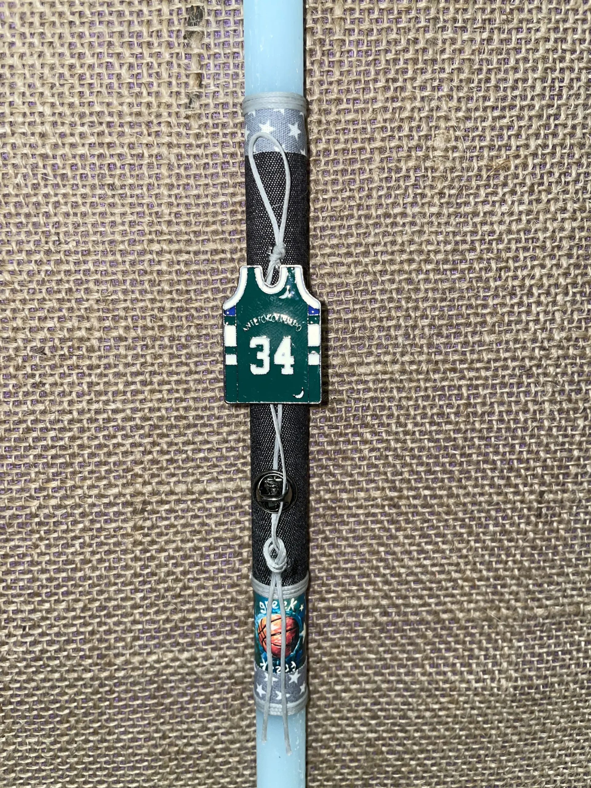Ετικέτα: Γαλάζιο στρογγυλό λαμπαδάκι με φανέλα μπάσκετ ''Αντετοκούμπο 34''