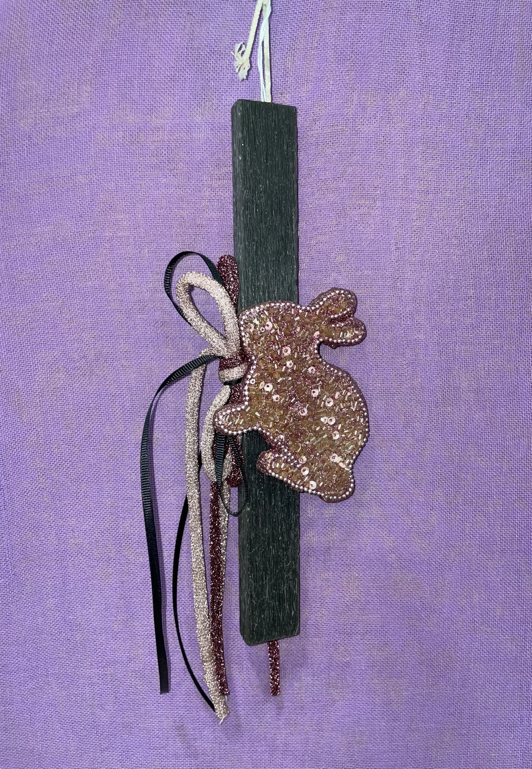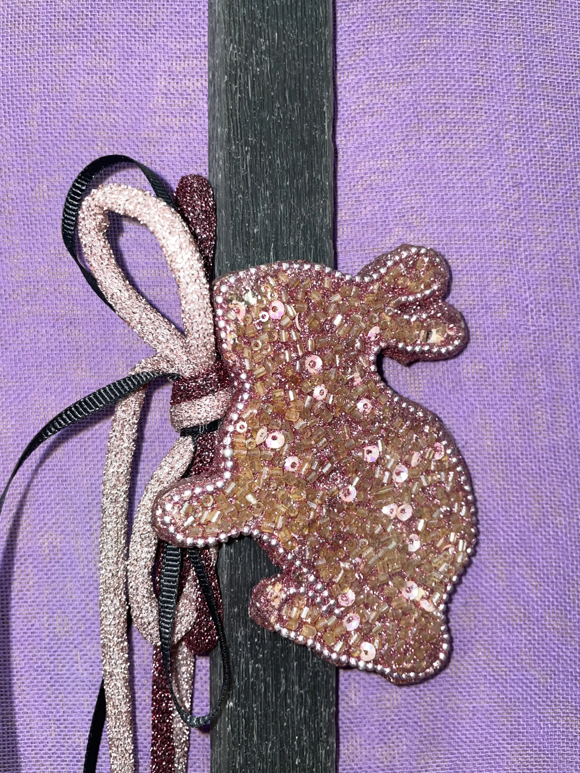 Γκρι πλακέ λαμπάδα με ροζ κουνέλι από χάντρες