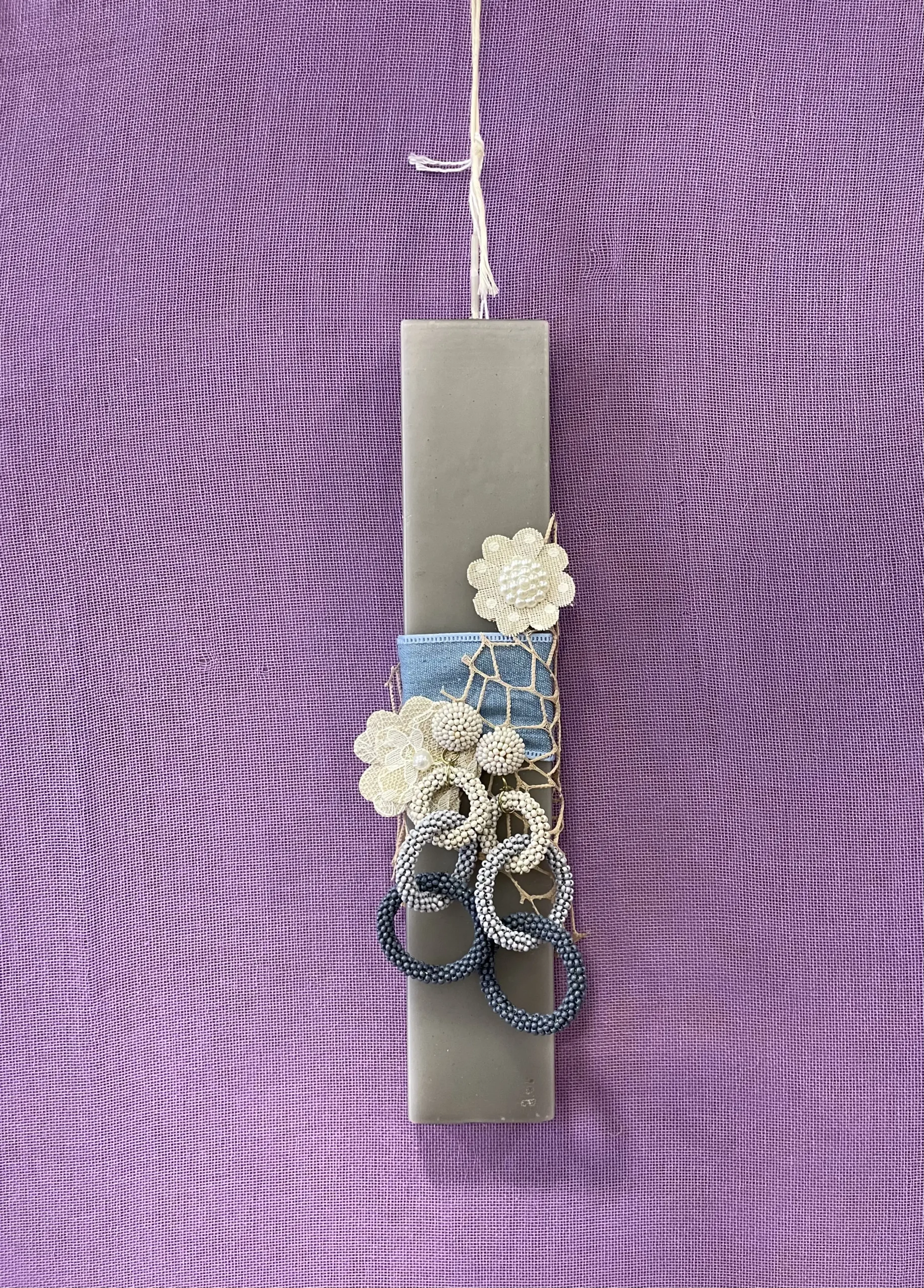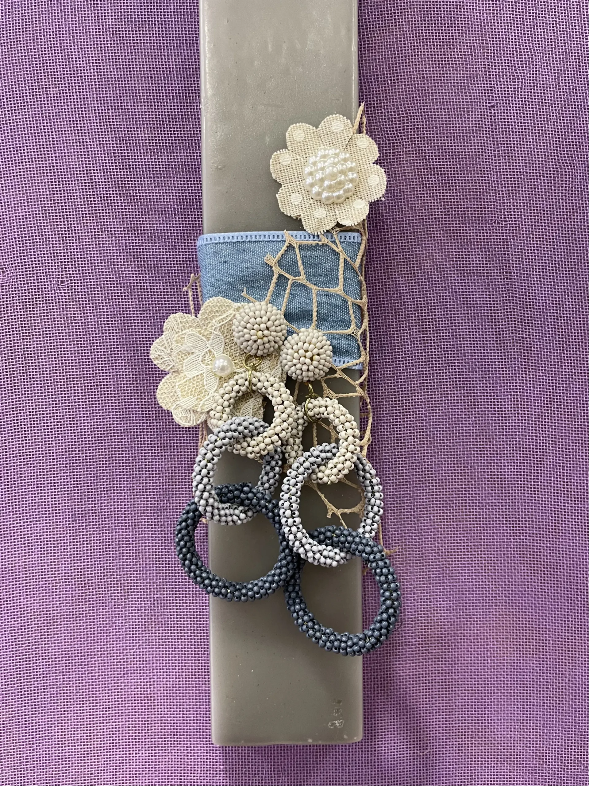 Γκρι πλακέ λαμπάδα με χειροποίητα κρεμαστά σκουλαρίκια μπεζ, γαλάζιο και μπλε