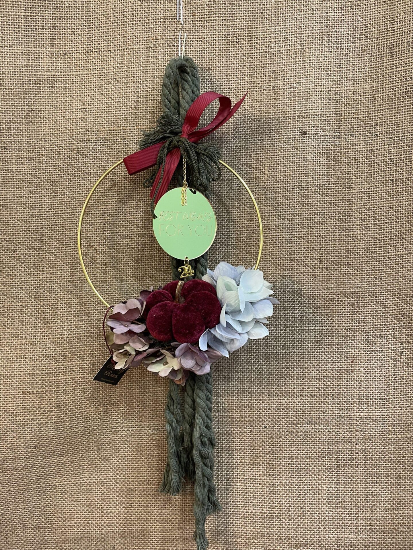 Γούρι κρεμαστό, μεταλλικό στεφάνι με μπορντώ βελούδινη κολοκύθα