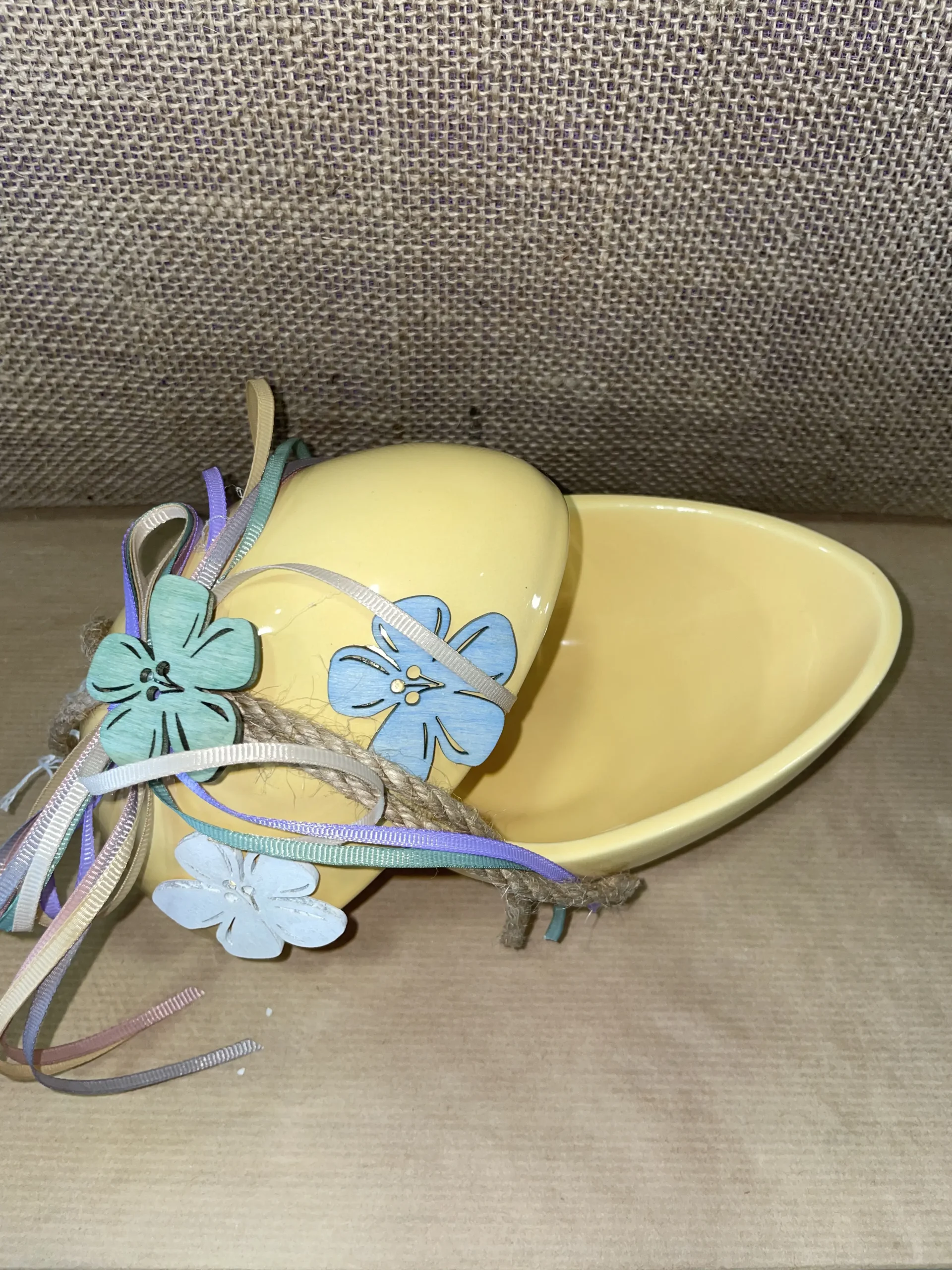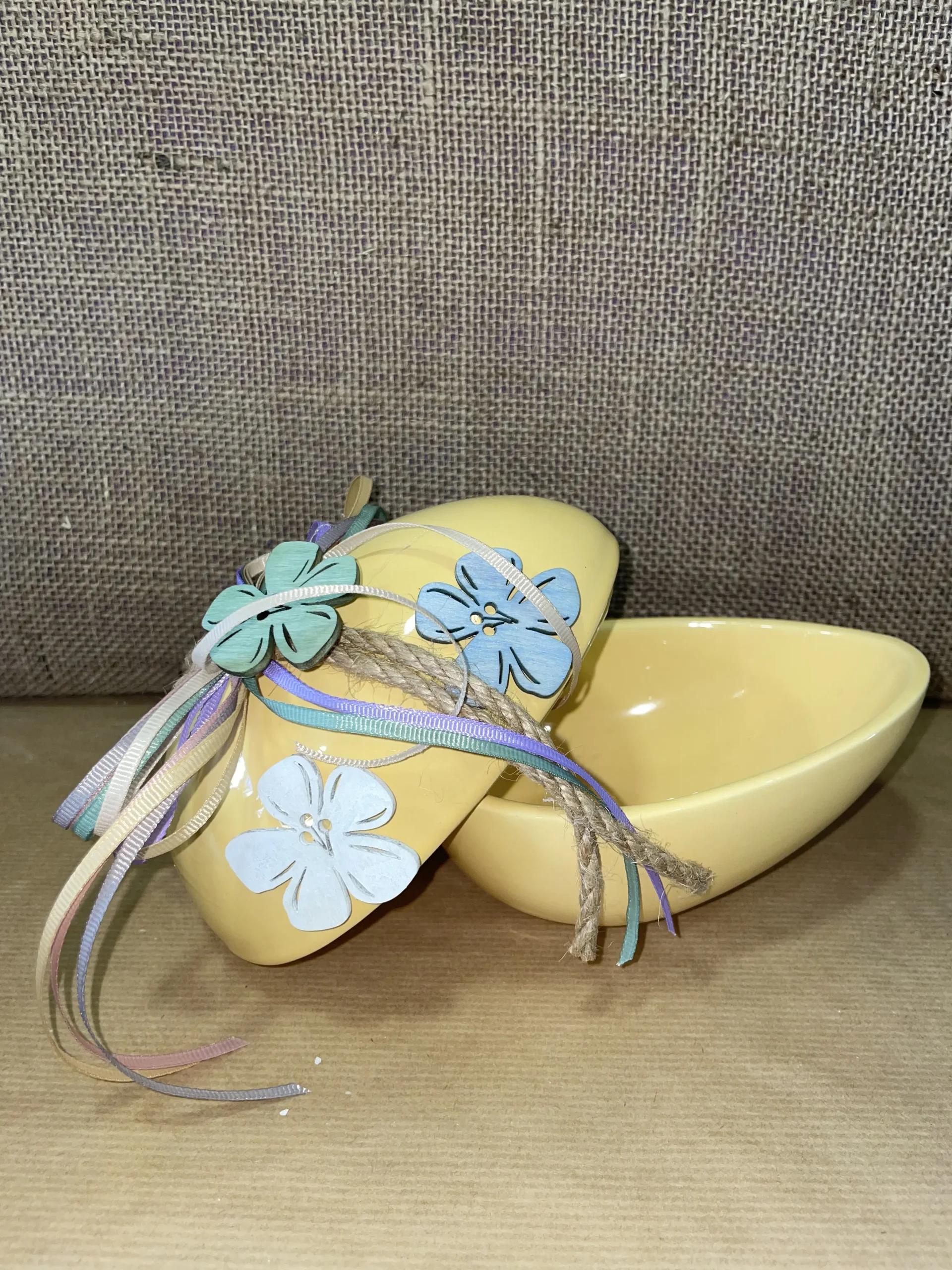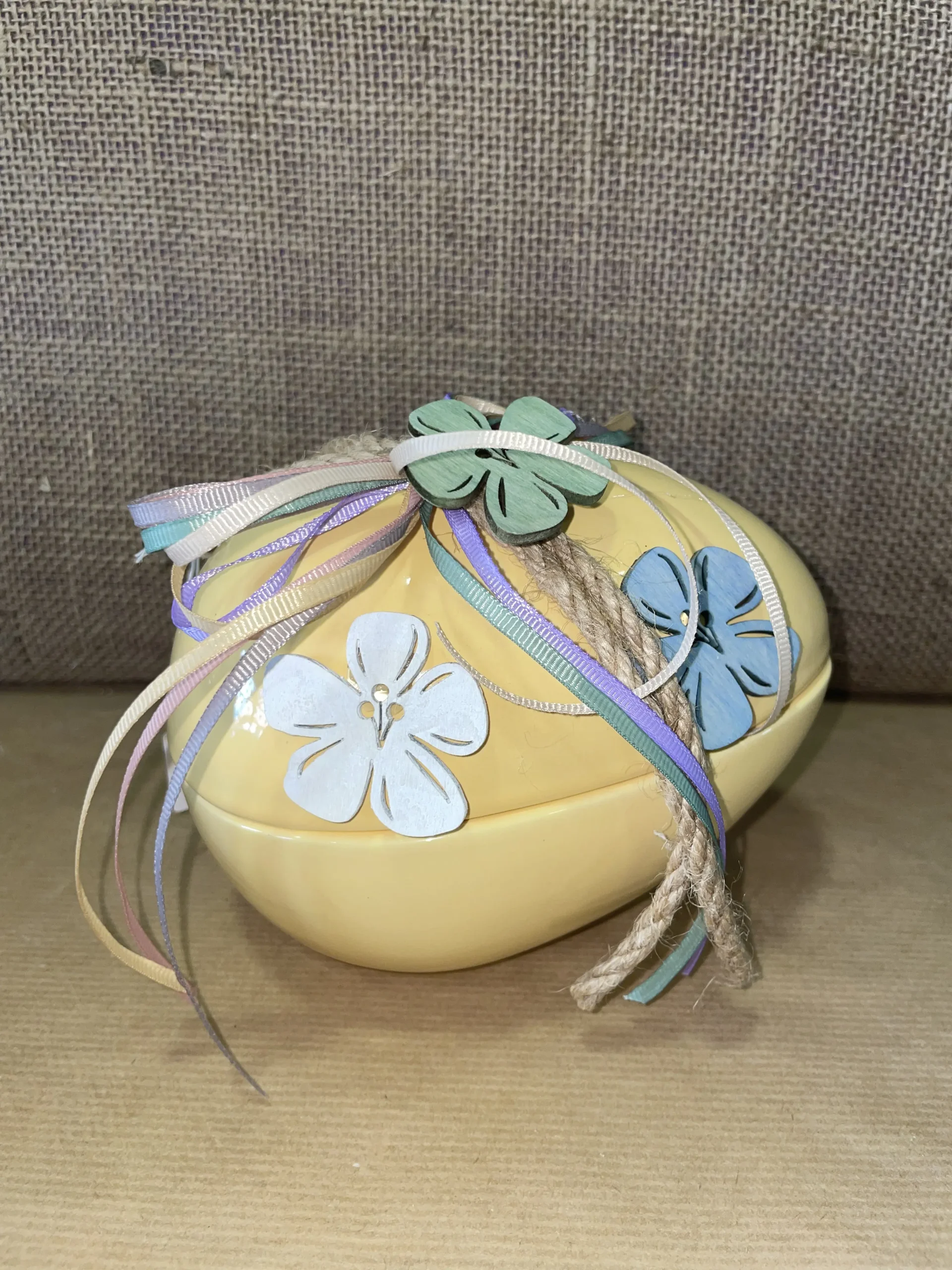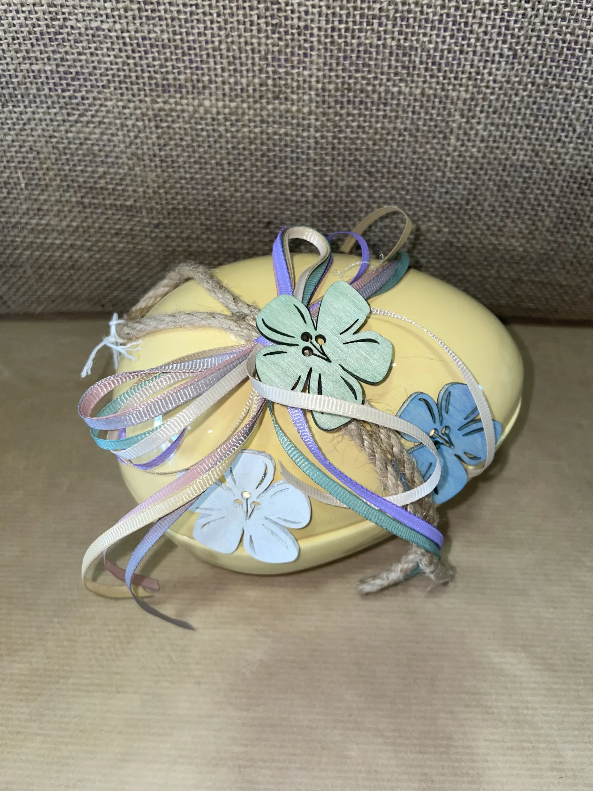 Κίτρινο κεραμικό αυγό μεσαίο με διακοσμητικά ξύλινα λουλούδια