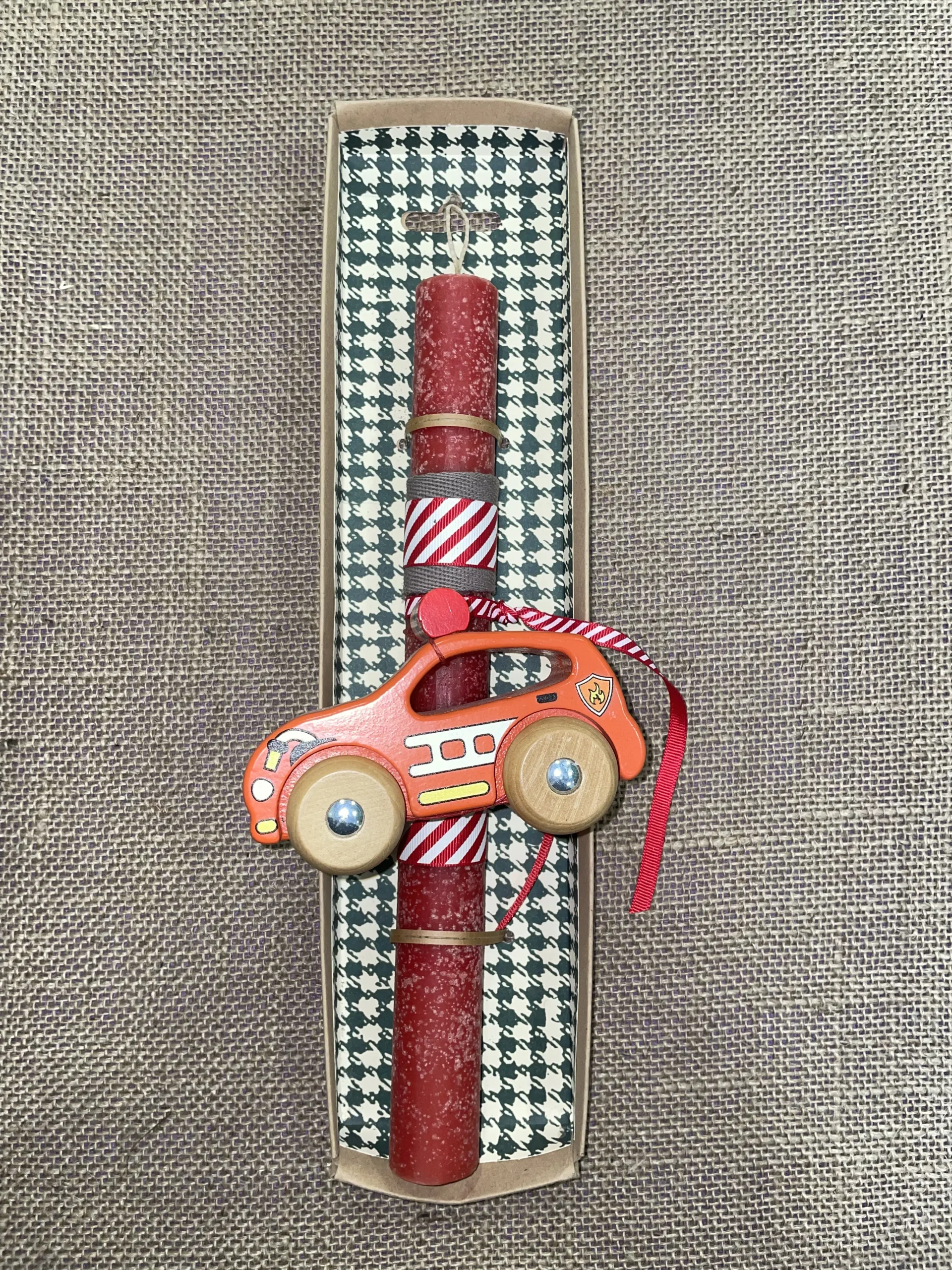 Κόκκινη πιτσιλωτή λαμπάδα με ξύλινο πυροσβεστικό αυτοκινητάκι