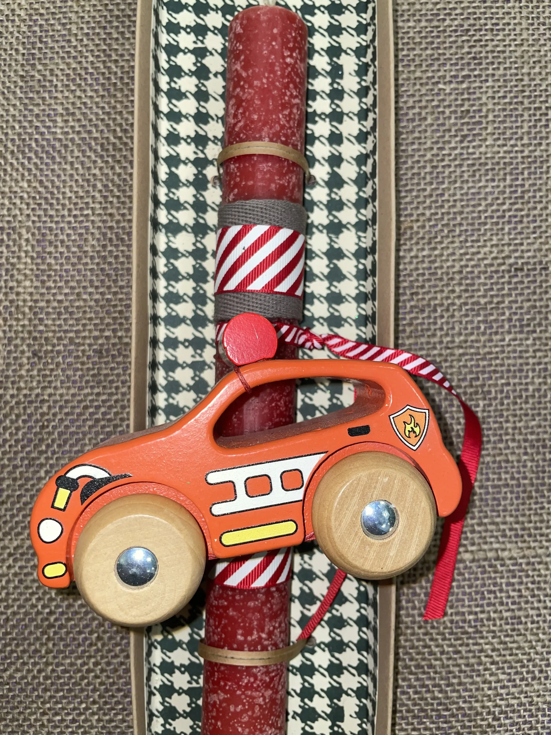 Ετικέτα: Κόκκινη πιτσιλωτή λαμπάδα με ξύλινο πυροσβεστικό αυτοκινητάκι