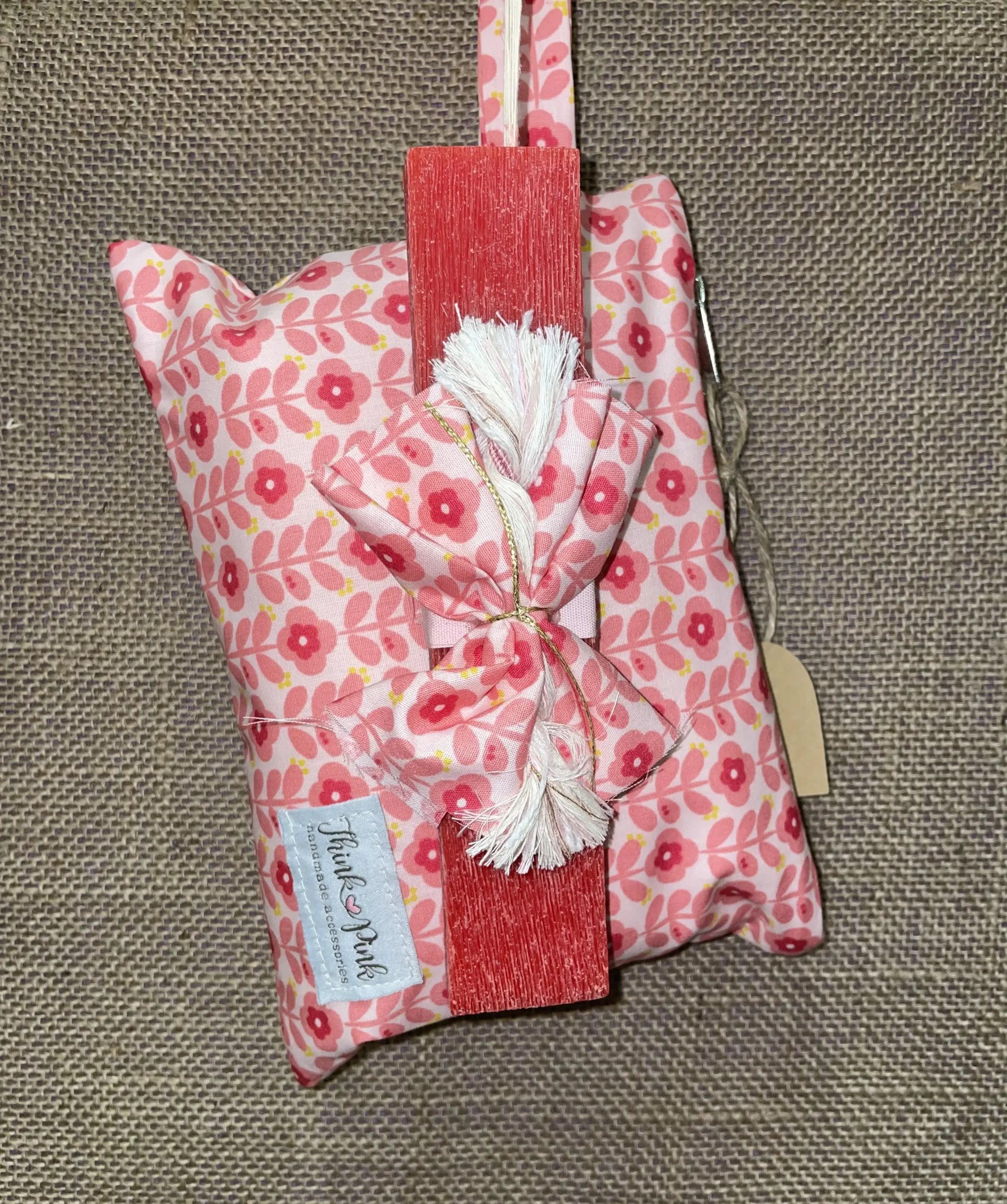 Κόκκινη πλακέ αρωματική λαμπάδα με κόκκινο φλοράλ ύφασμα και φλοράλ τσαντάκι