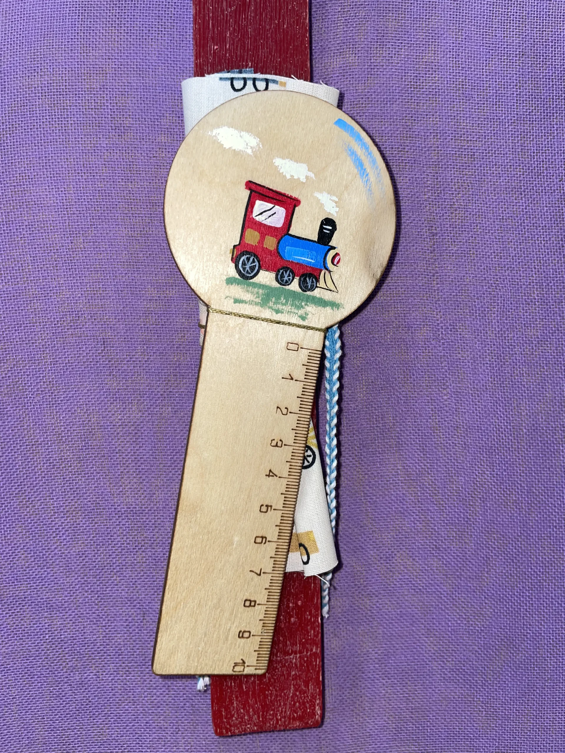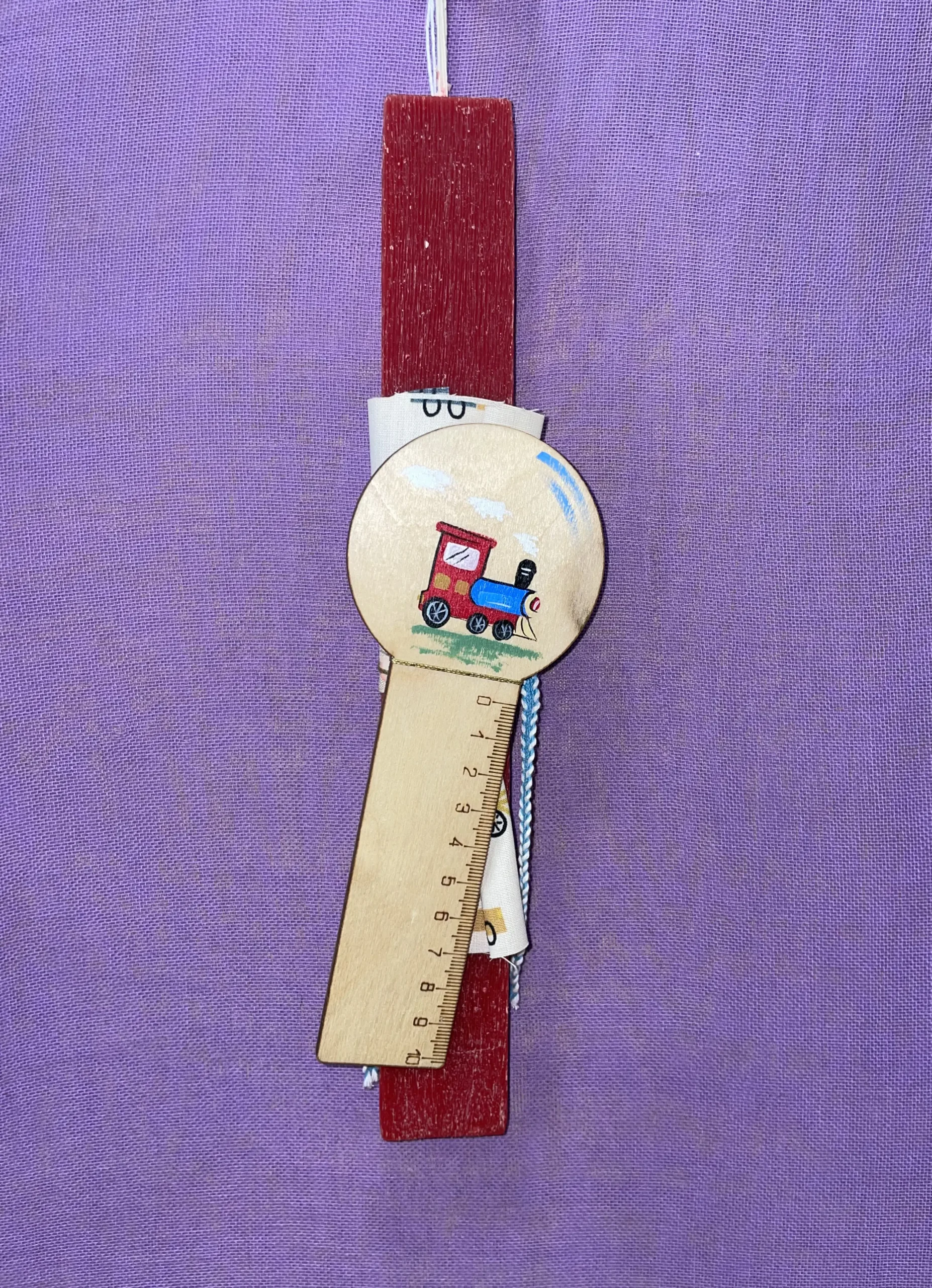 Κόκκινη πλακέ λαμπάδα με ξύλινο χάρακα με τρένο