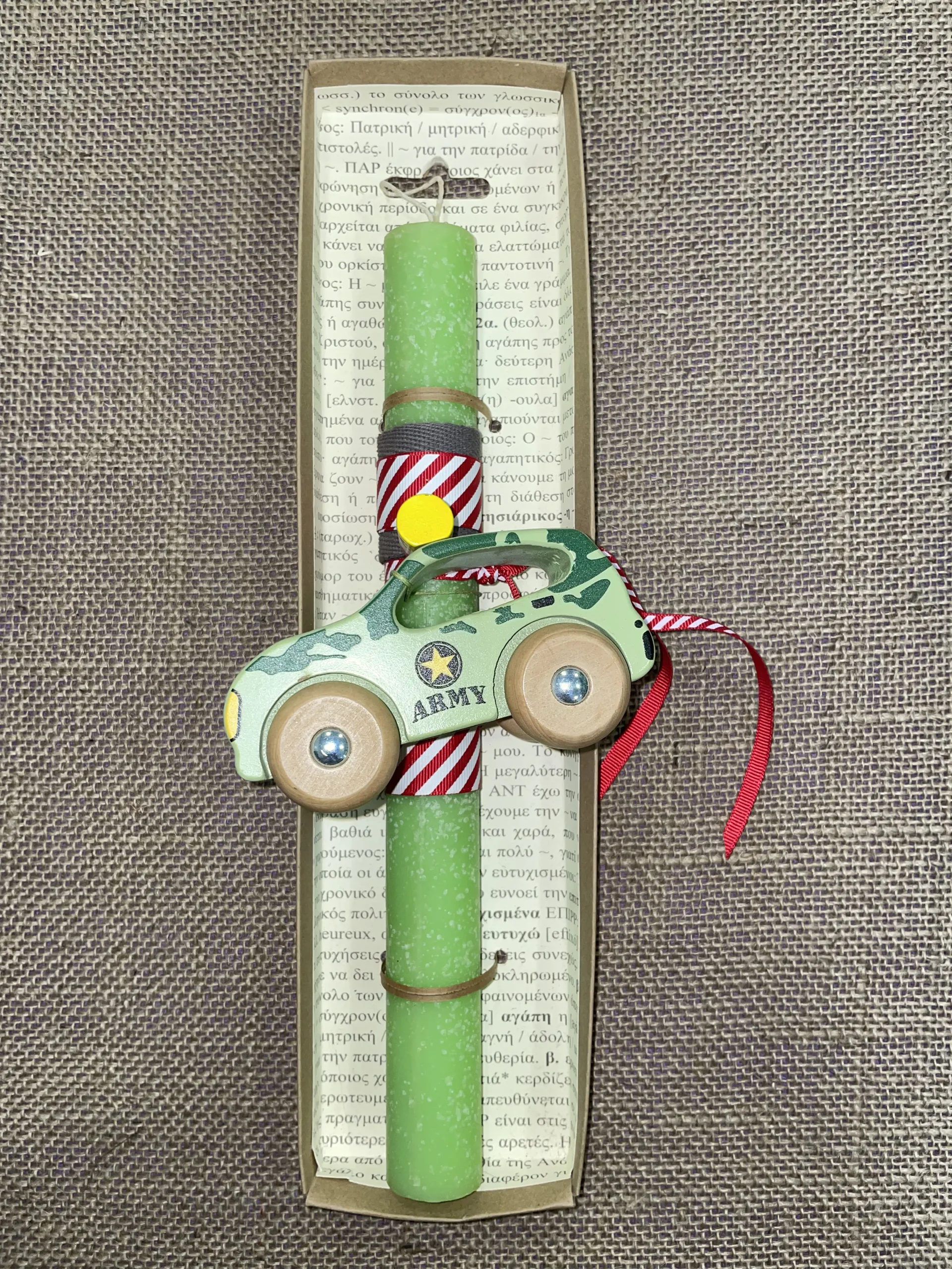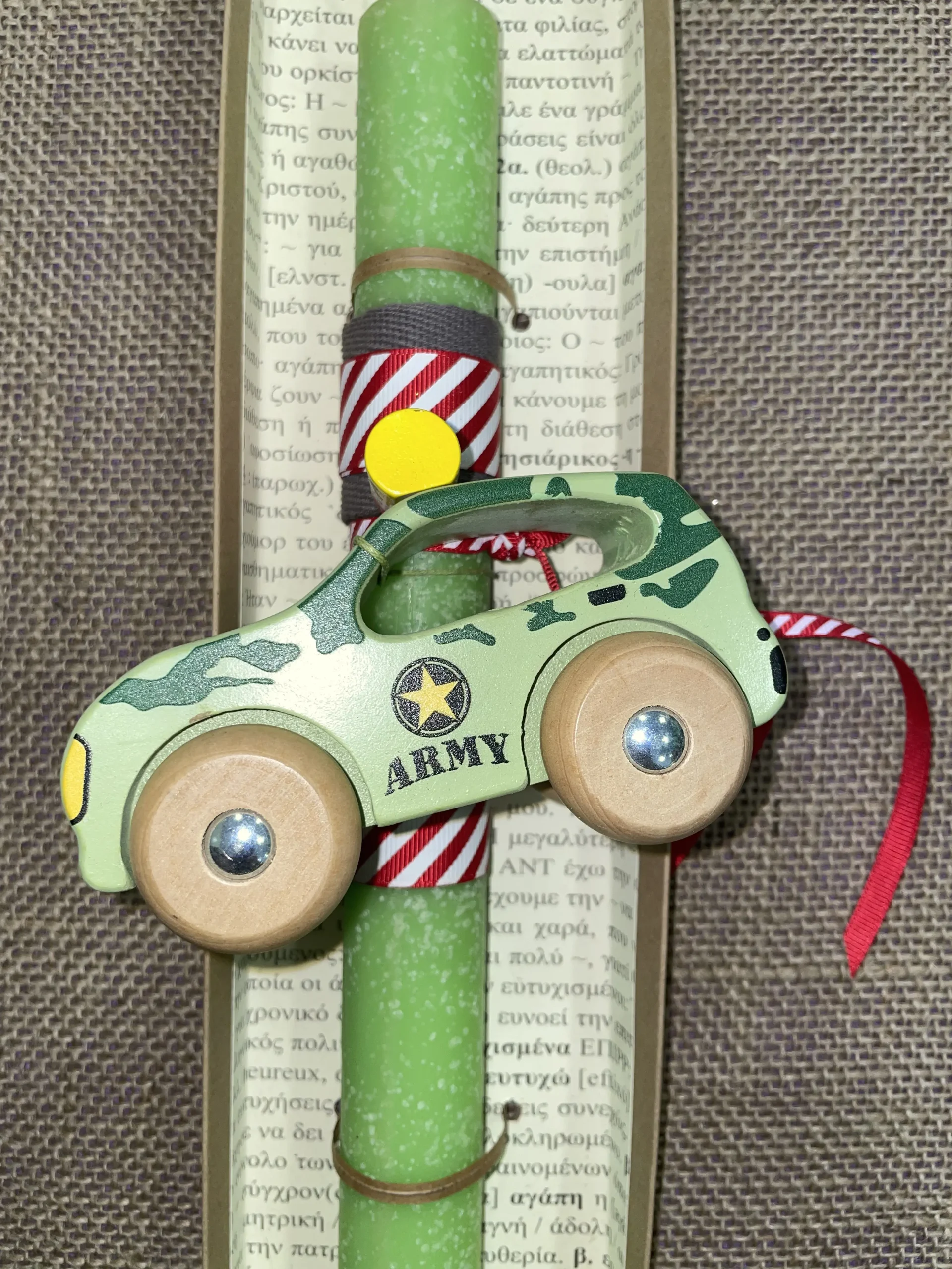 Λαχανί πιτσιλωτή λαμπάδα με ξύλινο στρατιωτικό αυτοκινητάκι ”Army”