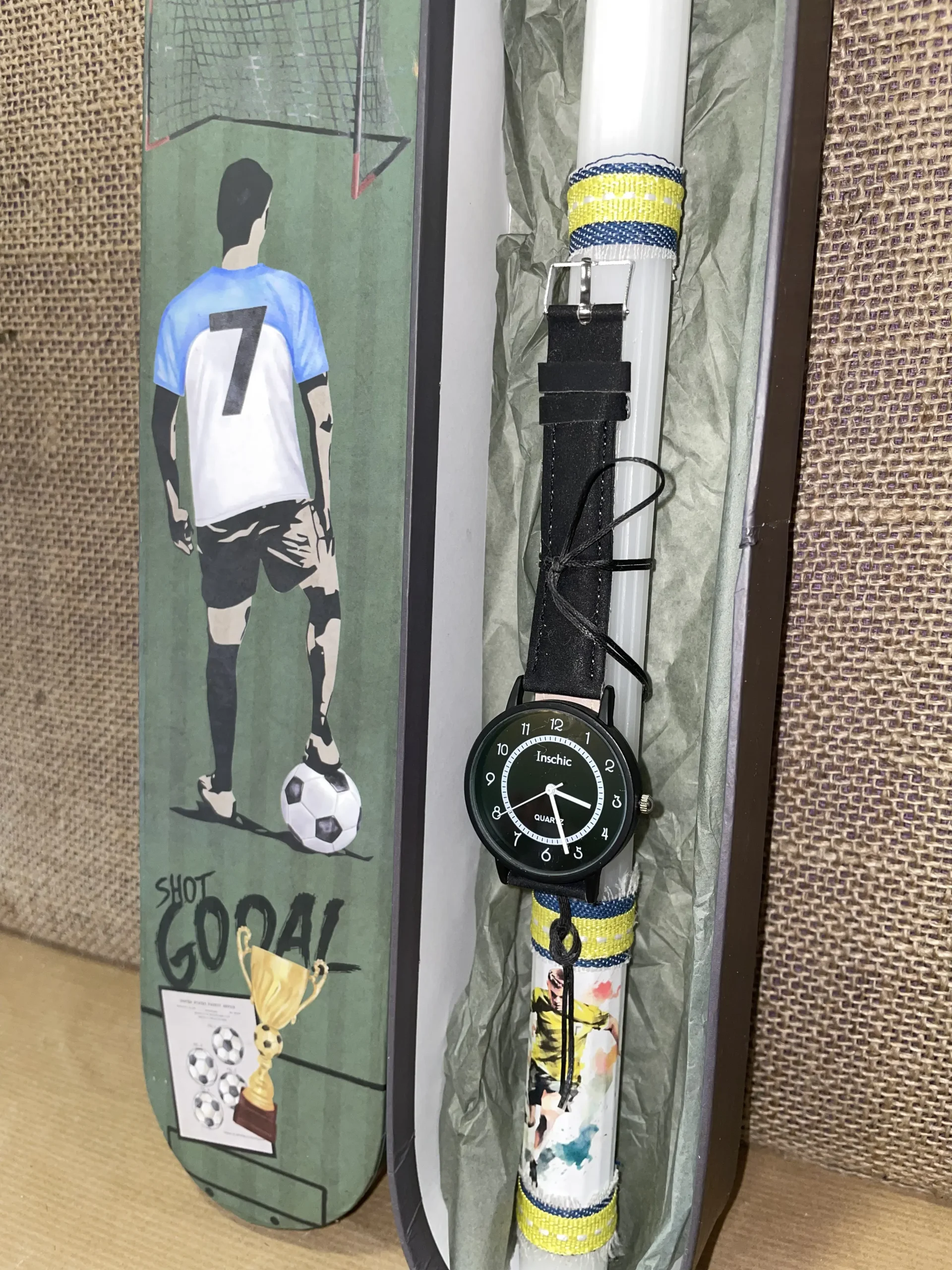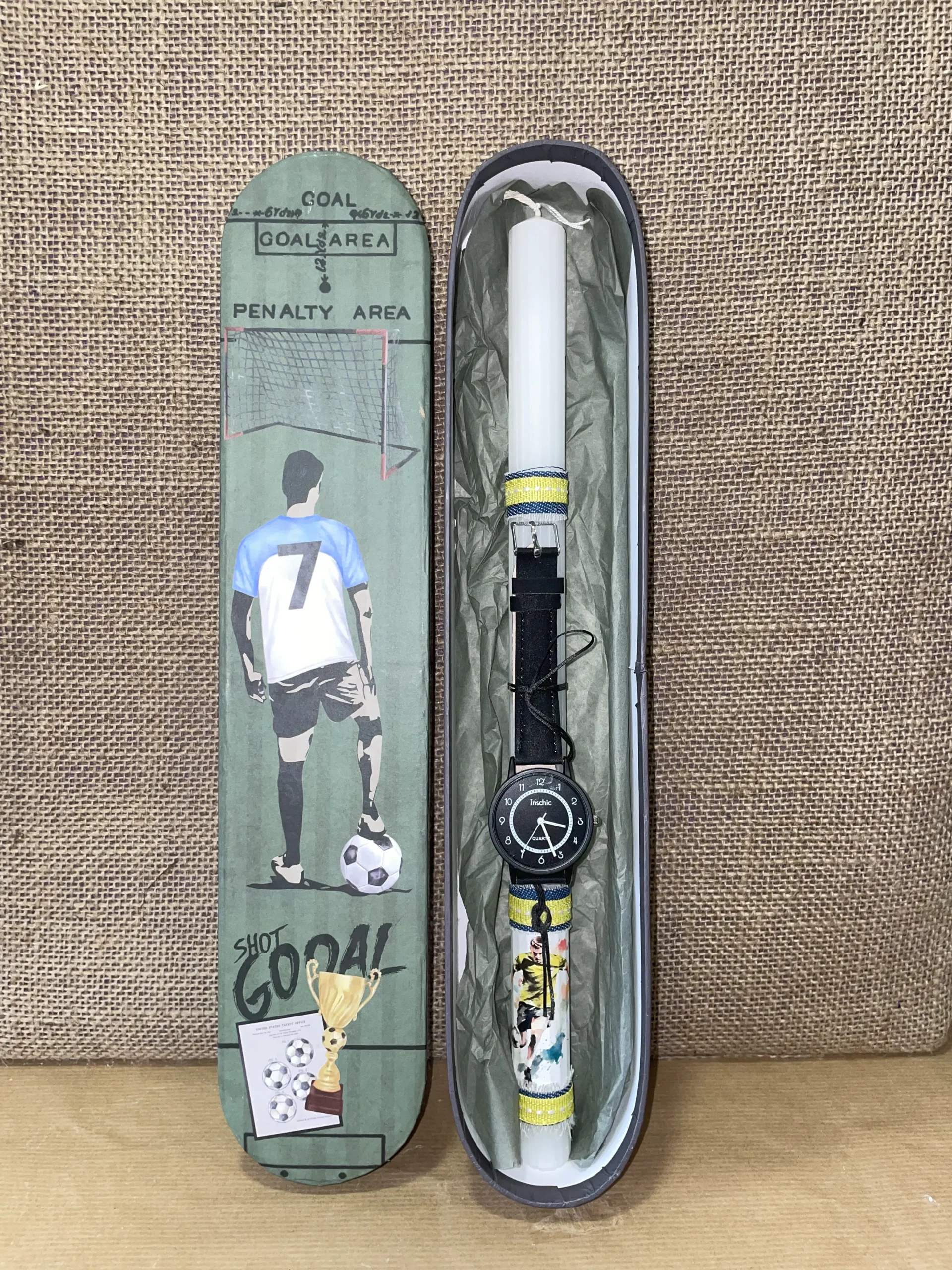 Λευκή με κίτρινο στρογγυλή λαμπάδα με ρολόϊ χειρός μαύρο – ΠΑΟΚ